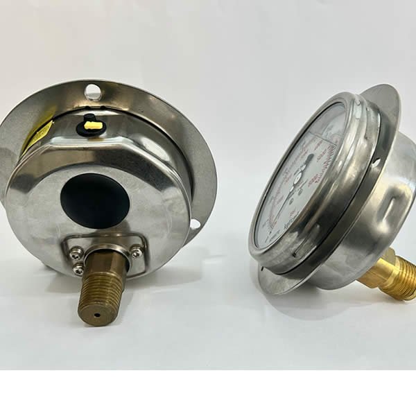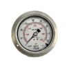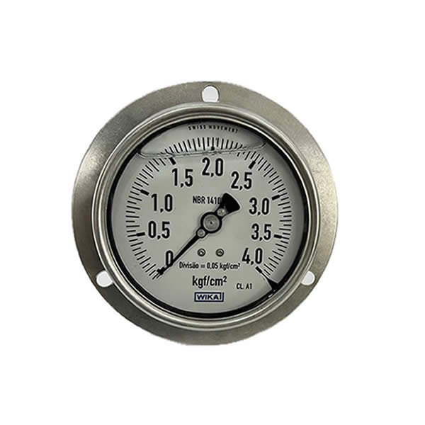 Manômetro 100mm, ligação horizontal (excêntrica), escala 0-4 kgf / cm², caixa em aço inox com anel baioneta, internos em latão, com enchimento de glicerina e flange, classe de exatidão A1, conexão 1/2″ npt, Wika.