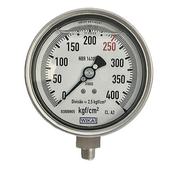 Manômetro 100mm, ligação vertical, escala 0-400 kgf / cm², caixa em aço inox com anel baioneta, internos em inox, com enchimento de glicerina, classe de exatidão A2, conexão 1/4 npt, Wika.