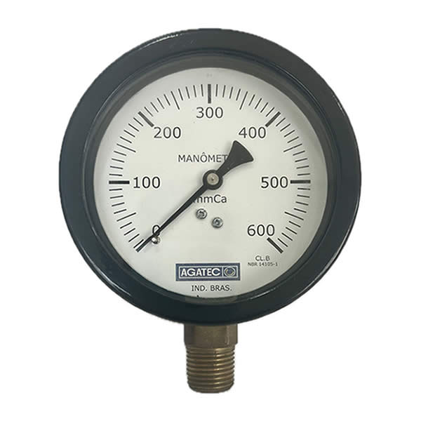 Manômetro 100mm, ligação vertical, escala 0 – 600 mmca, caixa aço carbono, internos em liga de cobre, classe de exatidão B, conexão 1/2 npt, Agatec.