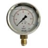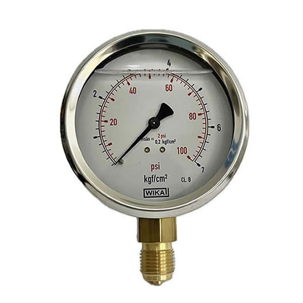 Manômetro 100mm, ligação vertical, escala dupla 100 psi x 7 kgf / cm², caixa em aço inox com anel recravado, internos em liga de cobre, com enchimento de glicerina, classe de exatidão B, conexão ½ bsp, Wika.