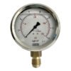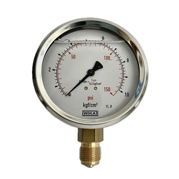 Manômetro 100mm, ligação vertical, escala dupla 150 psi x 10 kgf / cm², caixa em aço inox com anel recravado, internos em liga de cobre, com enchimento de glicerina, classe de exatidão B, conexão ½ bsp, Wika.