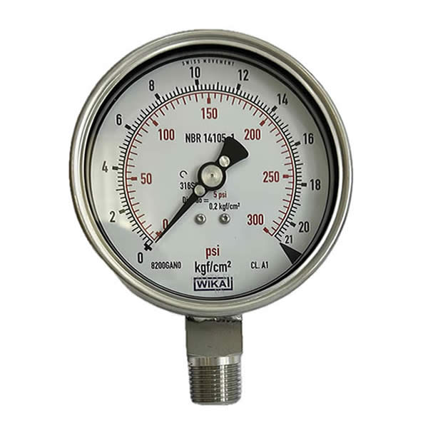 Manômetro 100mm, ligação vertical, escala dupla 300 psi x 21 kgf / cm², caixa em aço inox com anel baioneta, internos em inox, com enchimento de glicerina, classe de exatidão A1, conexão ½ npt, Wika.