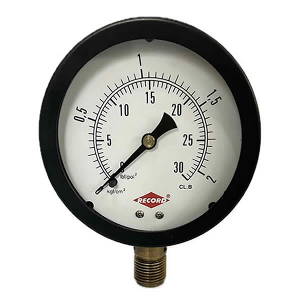 Manômetro 100mm, ligação vertical, escala dupla 30 psi x 2 kgf / cm², caixa aço carbono, internos em liga de cobre, classe de exatidão B, conexão 1/2 bsp, Record.