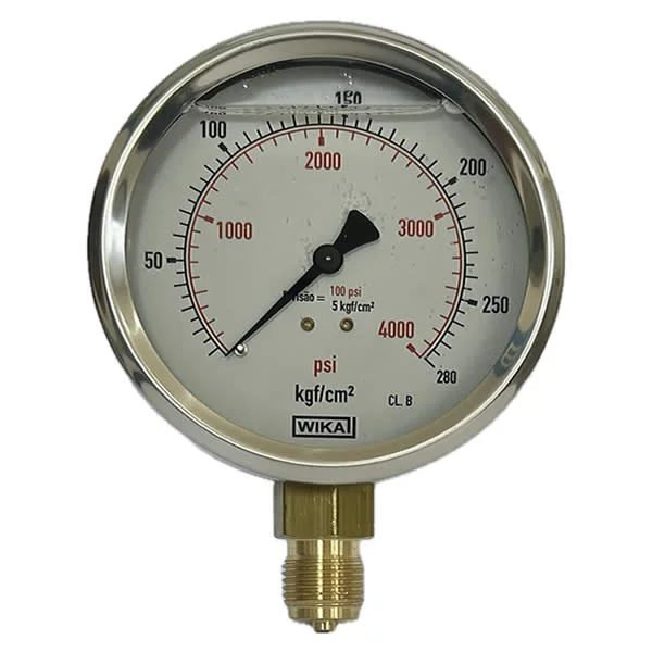 Manômetro 100mm, ligação vertical, escala dupla 3900 psi x 280 kgf / cm², caixa em aço inox com anel recravado, internos em liga de cobre, com enchimento de glicerina, classe de exatidão B, conexão ½ bsp, Wika.