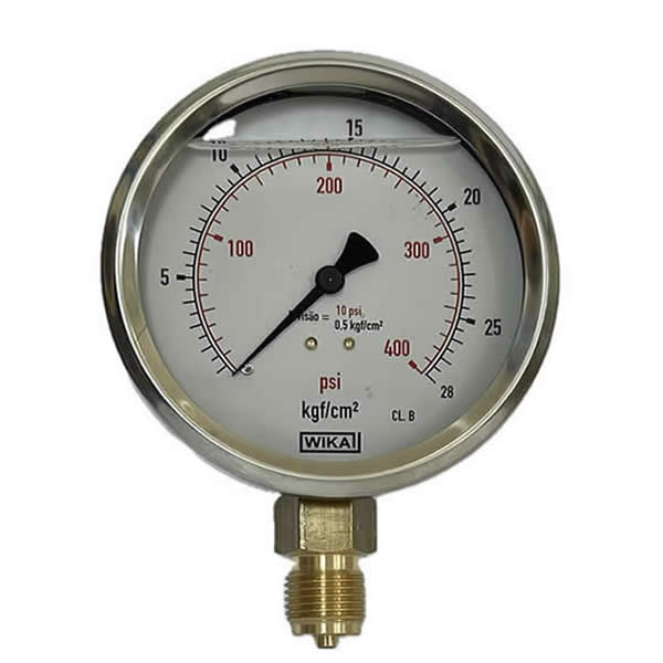Manômetro 100mm, ligação vertical, escala dupla 400 psi x 28 kgf / cm², caixa em aço inox com anel recravado, internos em liga de cobre, com enchimento de glicerina, classe de exatidão B, conexão ½ bsp, Wika.