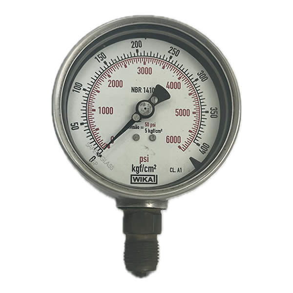 Manômetro 100mm, ligação vertical, escala dupla 6000 psi x 400 kgf / cm², caixa em aço inox com anel baioneta, internos em liga de cobre, com enchimento de glicerina, classe de exatidão A1, conexão ½ bsp, Wika.