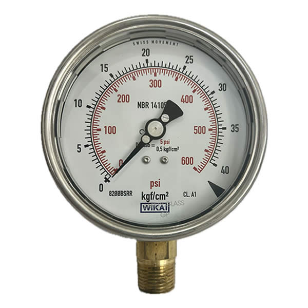 Manômetro 100mm, ligação vertical, escala dupla 600 psi x 40 kgf / cm², caixa em aço inox com anel baioneta, internos em liga de cobre, com enchimento de glicerina, classe de exatidão A1, conexão ½ npt, Wika.