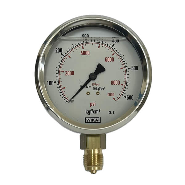 Manômetro 100mm, ligação vertical, escala dupla 9000 psi x 600 kgf / cm², caixa em aço inox com anel recravado, internos em liga de cobre, com enchimento de glicerina, classe de exatidão B, conexão ½ bsp, Wika.
