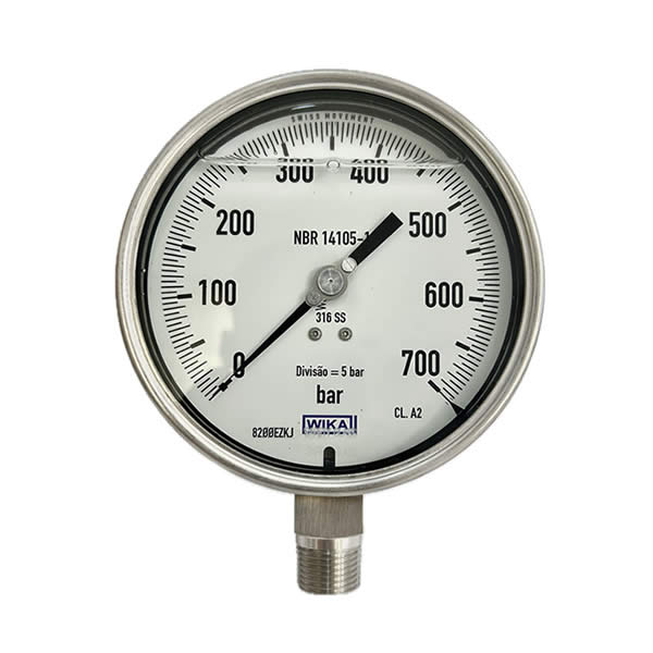 Manômetro 115mm, ligação vertical, escala 0 – 700 bar / cm², caixa em aço inox com anel baioneta, internos em inox, com enchimento de glicerina, classe de exatidão A1, conexão 1/2 npt, Wika.
