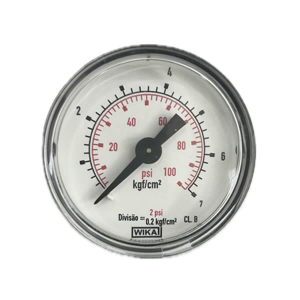 Manômetro 40mm, ligação horizontal, escala dupla 100 psi x 7 kgf / cm², caixa abs, internos em liga de cobre, classe de exatidão B, conexão 1/8 npt, Wika.