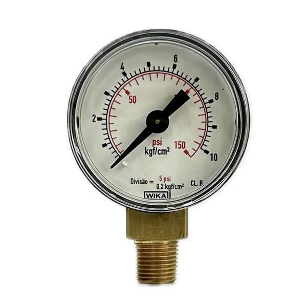 Manômetro 40mm, ligação vertical, escala dupla 150 psi x 10 kgf / cm², caixa abs, internos em liga de cobre, classe de exatidão B, conexão 1/8 npt, Wika.
