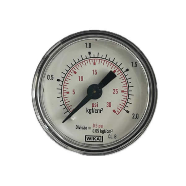 Manômetro 40mm, ligação horizontal, escala dupla 30 psi x 2 kgf / cm², caixa abs, internos em liga de cobre, classe de exatidão B, conexão 1/8 npt, Wika.