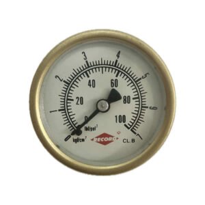 Manômetro 63mm, ligação horizontal, escala dupla 100 psi x 7 kgf / cm², caixa em latão forjado, internos em liga de cobre, classe de exatidão B, conexão 1/4 npt, Record.