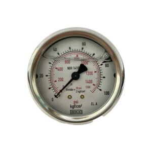 Manômetro 63mm, ligação horizontal, escala dupla 1500 psi x 100 kgf / cm 2, caixa em aço inox com anel recravado, internos em liga de cobre, com enchimento de glicerina, classe de exatidão A, conexão 1/4 Npt, Wika.