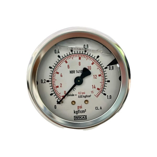 Manômetro 63mm, ligação horizontal, escala dupla 15 psi x 1 kgf / cm 2, caixa em aço inox com anel recravado, internos em liga de cobre, com enchimento de glicerina, classe de exatidão A, conexão 1/4 Npt, Wika.