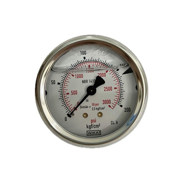 Manômetro 63mm, ligação horizontal, escala dupla 3000 psi x 200 kgf / cm 2, caixa em aço inox com anel recravado, internos em liga de cobre, com enchimento de glicerina, classe de exatidão A, conexão 1/4 Npt, Wika.
