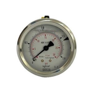Manômetro 63mm, ligação horizontal, escala dupla 30 psi x 2 kgf / cm 2, caixa em aço inox com anel recravado, internos em liga de cobre, com enchimento de glicerina, classe de exatidão A, conexão 1/4 Npt, Wika.