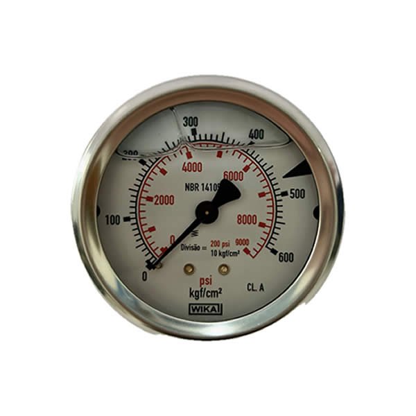 Manômetro 63mm, ligação horizontal, escala dupla 9000 psi x 600 kgf / cm 2, caixa em aço inox com anel recravado, internos em liga de cobre, com enchimento de glicerina, classe de exatidão A, conexão 1/4 Npt, Wika.