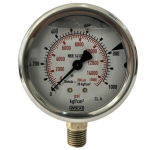 Manômetro 63mm, ligação vertical, escala dupla 15000 psi x 1000 kgf / cm 2, caixa em aço inox com anel recravado, internos em liga de cobre, com enchimento de glicerina, classe de exatidão A, conexão 1/4 Npt, Wika.