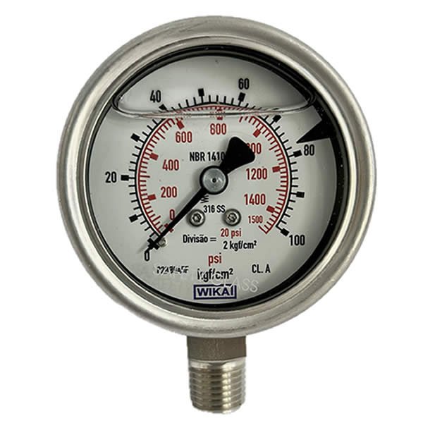 Manômetro 63mm, ligação vertical, escala dupla 1500 psi x 100 kgf / cm², caixa em aço inox com anel baioneta, internos em inox, com enchimento de glicerina, classe de exatidão A, conexão 1/4″ npt, Wika.