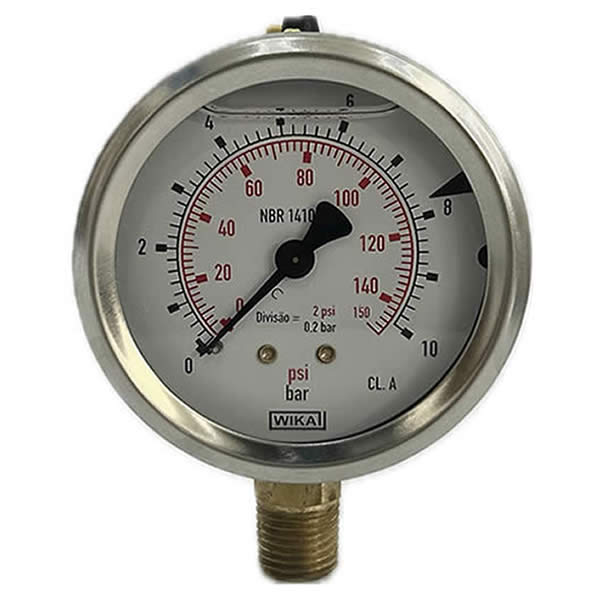 Manômetro 63mm, ligação vertical, escala dupla 150 psi x 10 bar, caixa em aço inox com anel recravado, internos em liga de cobre, com enchimento de glicerina, classe de exatidão A, conexão 1/4 Npt, Wika.