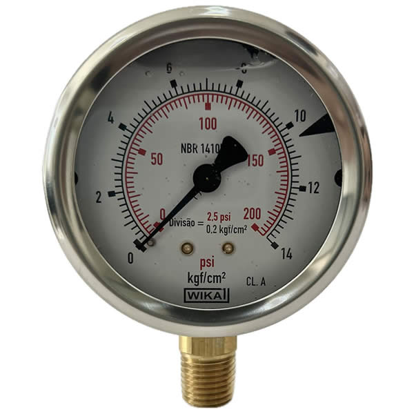 Manômetro 63mm, ligação vertical, escala dupla 200 psi x 14 kgf / cm 2, caixa em aço inox com anel recravado, internos em liga de cobre, com enchimento de glicerina, classe de exatidão A, conexão 1/4 Npt, Wika.