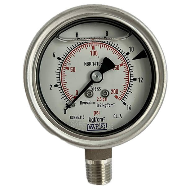 Manômetro 63mm, ligação vertical, escala dupla 200 psi x 14 kgf / cm², caixa em aço inox com anel baioneta, internos em inox, com enchimento de glicerina, classe de exatidão A, conexão 1/4″ npt, Wika.