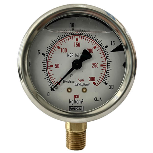 Manômetro 63mm, ligação vertical, escala dupla 300 psi x 20 kgf / cm 2, caixa em aço inox com anel recravado, internos em liga de cobre, com enchimento de glicerina, classe de exatidão A, conexão 1/4 Npt, Wika.