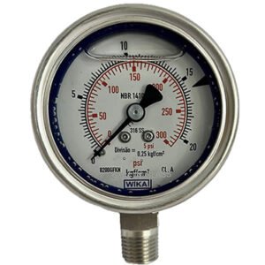 Manômetro 63mm, ligação vertical, escala dupla 300 psi x 20 kgf / cm², caixa em aço inox com anel baioneta, internos em inox, com enchimento de glicerina, classe de exatidão A, conexão 1/4″ npt, Wika.