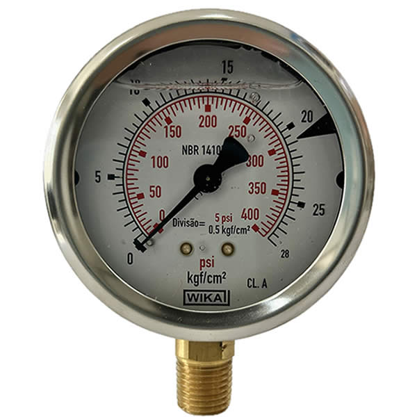 Manômetro 63mm, ligação vertical, escala dupla 400 psi x 28 kgf / cm 2, caixa em aço inox com anel recravado, internos em liga de cobre, com enchimento de glicerina, classe de exatidão A, conexão 1/4 Npt, Wika.
