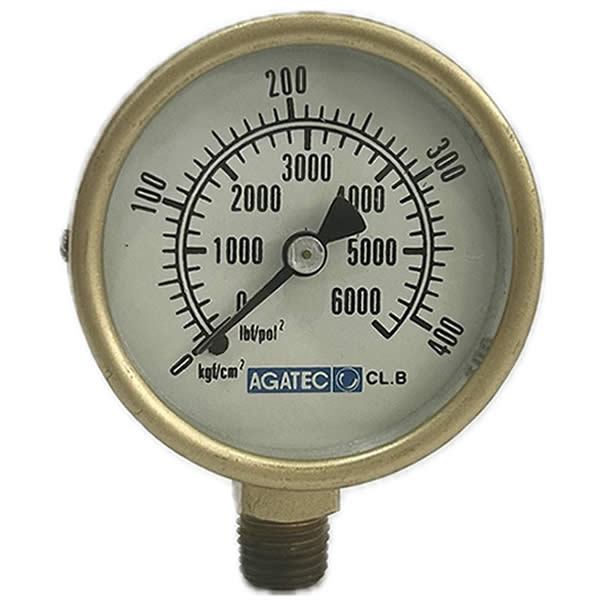 Manômetro 63mm, ligação vertical, escala dupla 6000 psi x 400 kgf / cm², caixa em latão forjado, internos em liga de cobre, classe de exatidão B, conexão 1/4 npt, Agatec