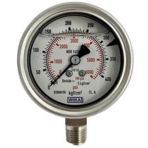 Manômetro 63mm, ligação vertical, escala dupla 6000 psi x 400 kgf / cm², caixa em aço inox com anel baioneta, internos em inox, com enchimento de glicerina, classe de exatidão A, conexão 1/4″ npt, Wika.