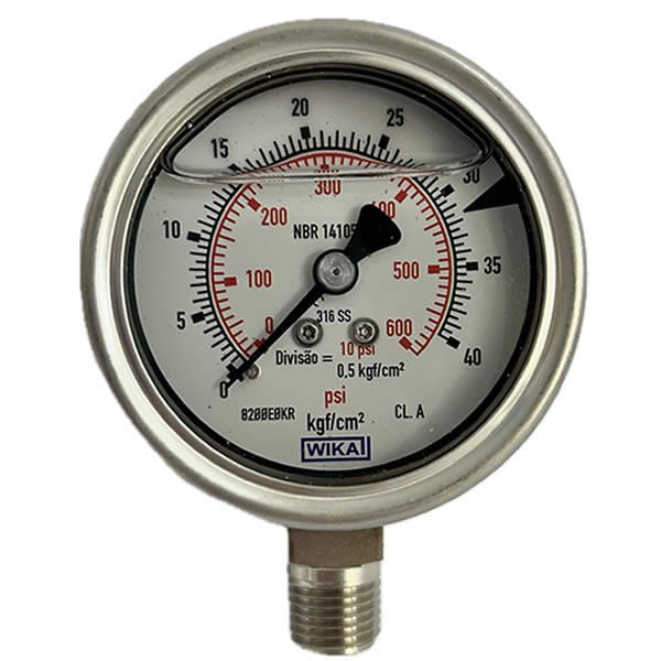 Manômetro 63mm, ligação vertical, escala dupla 600 psi x 40 kgf / cm², caixa em aço inox com anel baioneta, internos em inox, com enchimento de glicerina, classe de exatidão A, conexão 1/4″ npt, Wika.