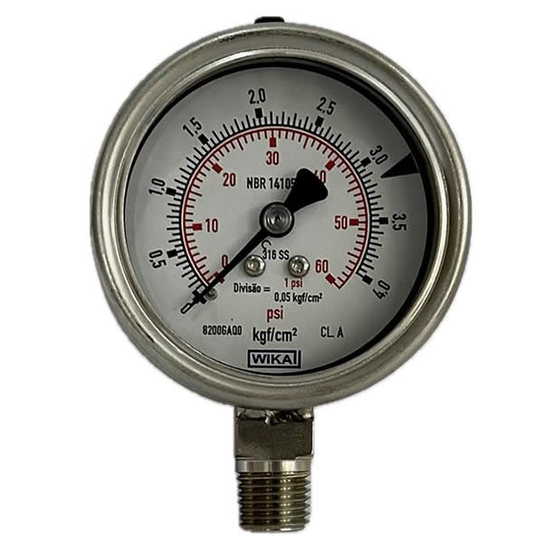 Manômetro 63mm, ligação vertical, escala dupla 60 psi x 4 kgf / cm², caixa em aço inox com anel baioneta, internos em inox, com enchimento de glicerina, classe de exatidão A, conexão 1/4″ npt, Wika.