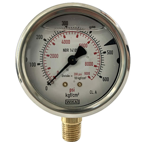 Manômetro 63mm, ligação vertical, escala dupla 9000 psi x 600 kgf / cm 2, caixa em aço inox com anel recravado, internos em liga de cobre, com enchimento de glicerina, classe de exatidão A, conexão 1/4 Npt, Wika.