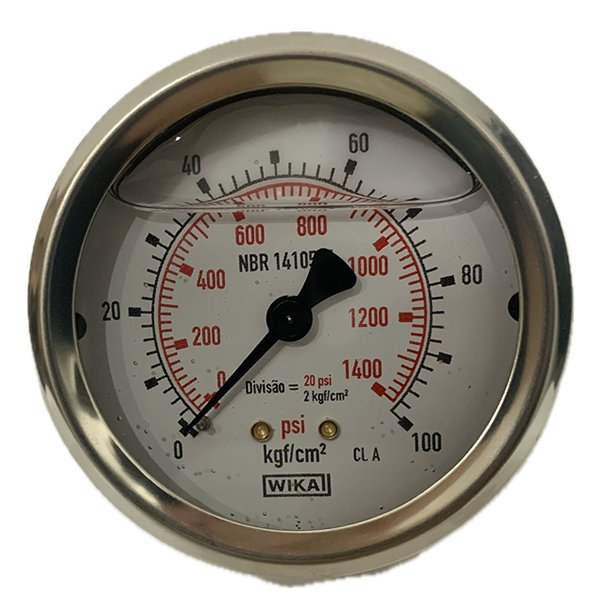 Manômetro 63mm, ligação horizontal, escala dupla 1400 psi x 100 kgf / cm 2, caixa em aço inox com anel recravado, internos em liga de cobre, com enchimento de glicerina, classe de exatidão A, conexão 1/4 Npt, Wika.