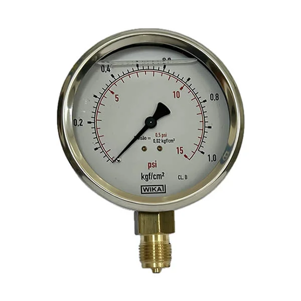 Manômetro 100mm, ligação vertical, escala dupla 14 psi x 1 kgf / cm², caixa em aço inox com anel recravado, internos em liga de cobre, com enchimento de glicerina, classe de exatidão B, conexão ½ bsp, Wika.