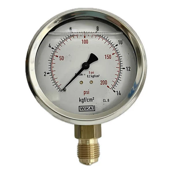 Manômetro 100mm, ligação vertical, escala dupla 199 psi x 14 kgf / cm², caixa em aço inox com anel recravado, internos em liga de cobre, com enchimento de glicerina, classe de exatidão B, conexão ½ bsp, Wika.