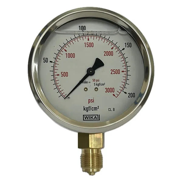 Manômetro 100mm, ligação vertical, escala dupla 2800 psi x 200 kgf / cm², caixa em aço inox com anel recravado, internos em liga de cobre, com enchimento de glicerina, classe de exatidão B, conexão ½ bsp, Wika.