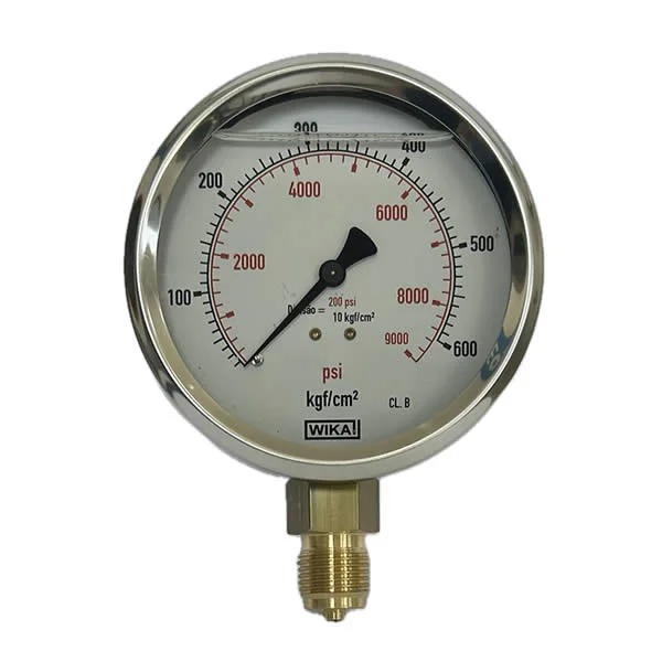 Manômetro 100mm, ligação vertical, escala dupla 8400 psi x 600 kgf / cm², caixa em aço inox com anel recravado, internos em liga de cobre, com enchimento de glicerina, classe de exatidão B, conexão ½ bsp, Wika.