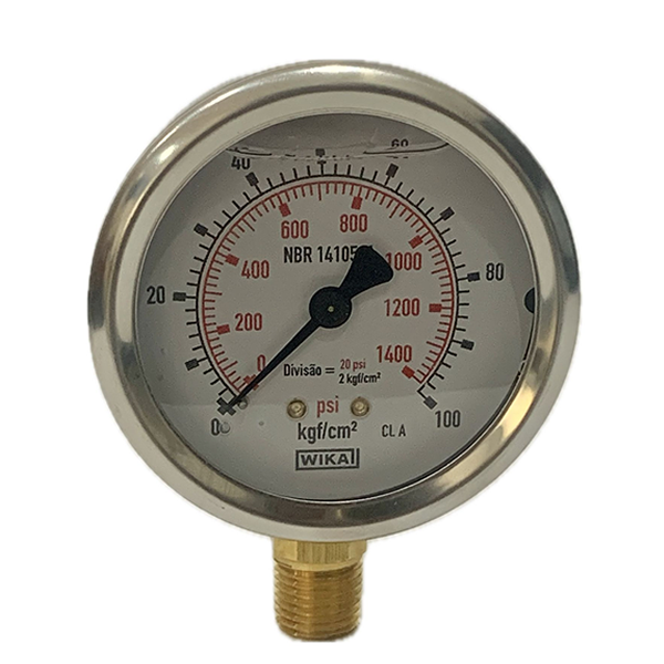 Manômetro 63mm, ligação vertical, escala dupla 1400 psi x 100 kgf / cm 2, caixa em aço inox com anel recravado, internos em liga de cobre, com enchimento de glicerina, classe de exatidão A, conexão 1/4 Npt, Wika.