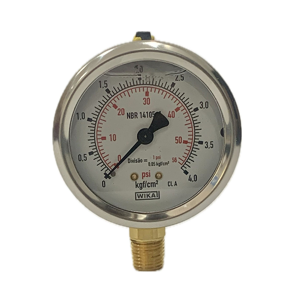 Manômetro 63mm, ligação vertical, escala dupla 56 psi x 4 kgf / cm 2, caixa em aço inox com anel recravado, internos em liga de cobre, com enchimento de glicerina, classe de exatidão A, conexão 1/4 Npt, Wika.