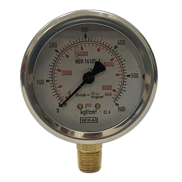 Manômetro 63mm, ligação vertical, escala dupla 8400 psi x 600 kgf / cm 2, caixa em aço inox com anel recravado, internos em liga de cobre, com enchimento de glicerina, classe de exatidão A, conexão 1/4 Npt, Wika.