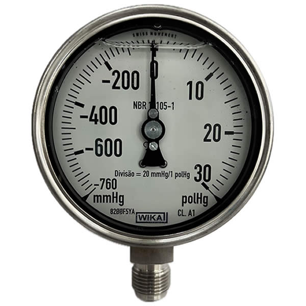 manovacuômetro 100mm, ligação vertical, -760 mmhg – 30 polhg / cm², caixa em aço inox com anel baioneta, internos em inox, com enchimento de glicerina, classe de exatidão A1, conexão ½ bsp, Wika.