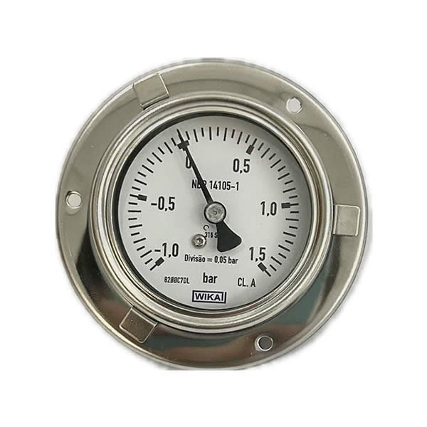 Manovacuômetro 63mm, ligação horizontal, -1 – 1,5 bar, caixa em aço inox com anel baioneta, internos em inox, com enchimento de glicerina e flange, classe de exatidão A, conexão 1/4 bsp, Wika.