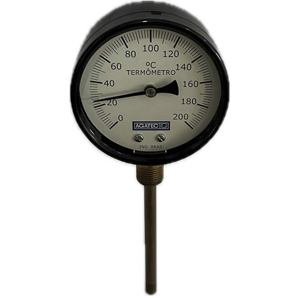 Termômetro bimetalico 100mm, ligação vertical escala 0 – 200 °C, rosca 1/2” bsp, haste em latão 3/8” x 140mm, caixa em aço carbono, classe B, Agatec.