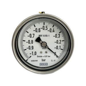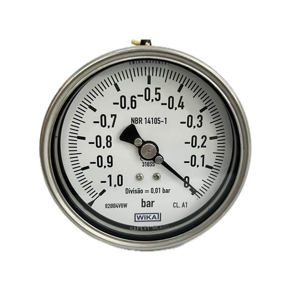Vacuômetro 100mm, ligação horizontal (excêntrico), -1 x 0 bar / cm 2, caixa em aço inox baioneta, internos em inox, com enchimento de glicerina, classe de exatidão A1, conexão 1/2 Npt, Wika.