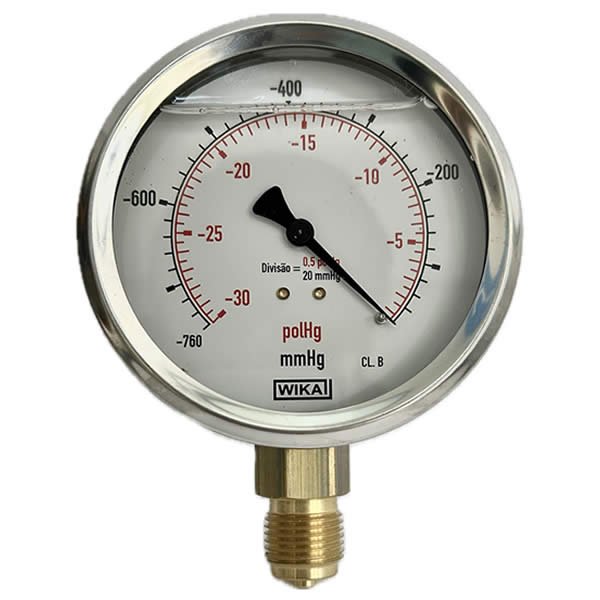 Vacuômetro 100mm, ligação vertical, escala dupla 30 polhg x 760 mmhg / cm², caixa em aço inox com anel recravado, internos em liga de cobre, com enchimento de glicerina, classe de exatidão B, conexão ½ bsp, Wika.