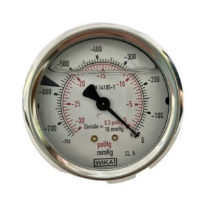 Vacuômetro 63mm, ligação horizontal, escala dupla -30 polHg x -760 mmHg, caixa em aço inox com anel recravado, internos em liga de cobre, com enchimento de glicerina, classe de exatidão A, conexão 1/4 Npt, Wika.