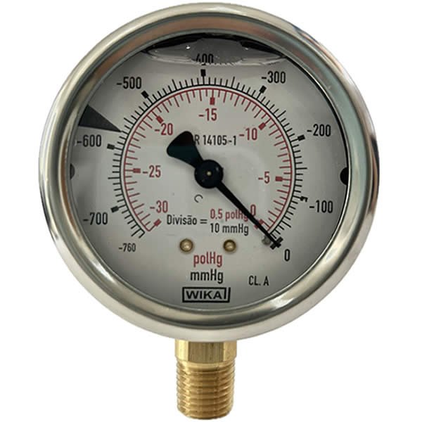 Vacuômetro 63mm, ligação vertical, escala dupla -30 polHg x -760 mmHg, caixa em aço inox com anel recravado, internos em liga de cobre, com enchimento de glicerina, classe de exatidão A, conexão 1/4 Npt, Wika.